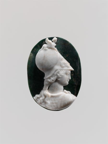 Curator: Today, we are looking at a delicate Neoclassical marble cameo created by Giuseppe Girometti between 1825 and 1850. It's titled "Thalia" and currently resides here at the Met. Editor: My first thought? It feels very self-contained. Like a precious secret held within that oval frame. Almost like looking at a goddess preserved in amber. Curator: The choice of marble is certainly key. Marble lends a certain gravitas, doesn't it? But it is the identity of the muse, Thalia that enriches the understanding. As one of the nine muses in Greek mythology, Thalia presided over comedy and idyllic poetry, symbolizing merriment and festive joy. This resonates deeply considering societal conceptions of women. Editor: Yes, exactly! Despite being rendered in cold marble, there is a sweetness there in her expression. What does that juxtaposition say, though? Was this piece a conscious dialogue with contemporary ideals of women’s role as keepers of domestic happiness and social delight? Or, a flat denial of societal roles, showing Thalia to simply be Thalia: a self-determined figurehead of comedy and poetry? Curator: Given its historical period, one could argue it serves as both an ideal and a subversion, navigating between expected societal roles and empowering representations of mythological figures. The cameo could be read as upholding Neoclassical values and aesthetic ideals that align with a particular social framework but, perhaps subtly, questions the limiting scope and role definitions through the selection of a divine subject and figure. Editor: That resonates so strongly, the tightrope walk between expectations. Even her style… I'm not seeing overt signs of rebellion, you know? Still within expected forms and shapes, the overall artistic constraints imposed upon women and their depiction, a sort of Neoclassical corset. I love this internal push-and-pull, like a conversation happening inside the cameo itself. Curator: Absolutely. Girometti was masterful at encapsulating a multitude of cultural influences into a delicate miniature portrait. He manages to place the object in history but subtly encourages present conversation through this timeless piece. Editor: A reminder that even something small can hold a whole world of meanings, constantly changing and yet somehow timeless.