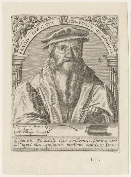 Curator: This engraving from the late 16th century, circa 1597-1599, presents us with a portrait of Leonhart Fuchs, now residing here at the Rijksmuseum. Editor: My first impression is one of somber authority. The intricate details achieved through engraving give it a feeling of meticulousness, almost scientific. Curator: Absolutely. The engraving process itself, demanding precision and labor, aligns with the intellectual gravity of Fuchs. Who was a renowned physician and botanist. Looking closely, we see he holds a sprig, a clear reference to his botanical work. Editor: Yes, and that plant points towards something fundamental here; that as much as intellect abstracts from nature, nature as material keeps asserting its presence in a field otherwise inclined to theoretical elaboration. It's present materially here in the plant itself, and represented in those hefty, almost geological-looking books. It speaks of an intimate knowledge through observation and labor. Curator: Precisely. Fuchs, during a time rife with medical and scientific upheaval, played a pivotal role in connecting textual knowledge with empirical observation. He attempted to correct errors inherited by traditional medicine. Editor: What do you mean? Curator: Well, he championed direct study of herbs and plants as the basis for pharmacology. It's radical when you think of it, it decenters older patriarchal knowledge in favor of, in essence, evidence found in nature itself. Editor: Indeed, by depicting Fuchs with both the tools of scholarship and the symbolic plant, the engraving highlights the merging of intellectual and practical labor and that friction of going out and discovering nature from just sitting in a library. We might look at it from the perspective of current intellectual debates, who gets access to education, scientific data, who is being left out. Curator: I see how your thinking on materiality directs that! Editor: Yes, focusing our thinking on what kind of body had access to that era’s institutions. This resonates strongly even today, as many continue advocating for inclusivity and accessibility in educational settings, scientific spaces, in medicine. It brings it back into the social realm. Curator: And considering it as a historical image made within a specific socioeconomic system gives this artwork a special depth for the audience. Thank you for sharing that perspective! Editor: My pleasure. I think paying attention to the actual texture of knowledge work and book-making lets the image vibrate in new and unexpected directions.