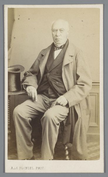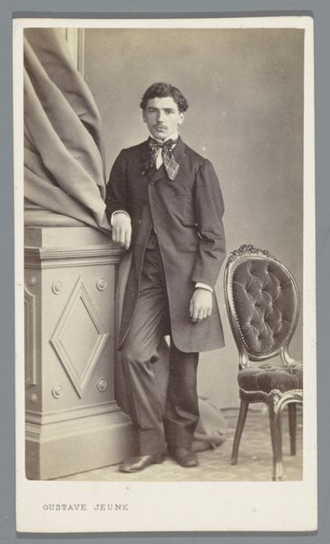This portrait of an unknown man was made by Gustav Schauer, a photographer active in the mid-19th century. The photograph, which is of the ‘carte de visite’ format, would have been relatively inexpensive to produce, and therefore available to a wider section of the middle classes in Europe. The man's formal attire signals his social standing and adherence to bourgeois norms, while the painted backdrop hints at wealth and refinement. Photography in this era served multiple purposes: it was a means of personal documentation, a tool for social climbing, and a reflection of the sitter's desired public persona. The photographic studio also became an important social institution. To fully understand this image, we might delve into archives of photography studios, historical accounts of bourgeois culture, and collections of portraiture to reconstruct the social and institutional contexts that shaped its creation and meaning. This way, we can start to interpret the ways that this portrait reflects and reinforces the social structures of its time.