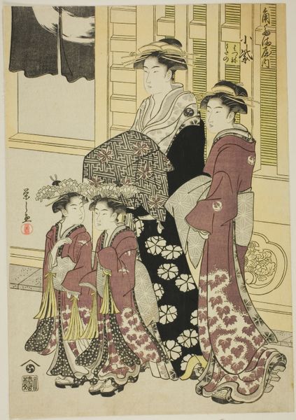 Editor: Let's discuss "Bewonderen van de kersenbloesem te Asukayama" a woodblock print by Katsukawa Shuncho, likely created between 1785 and 1790. It seems to capture a peaceful scene, but I'm curious, how do you interpret this work beyond its surface beauty? Curator: This print offers a lens into the lives of women during the Edo period. Their fashion signals social standing, of course, but what’s more fascinating to me is the subtext. These women are positioned within a rapidly changing urban environment. Asukayama was a place for leisure, created by the Shogun as a public garden. How do you think this democratisation of beauty and nature reflects on these women’s roles? Editor: That's an interesting point about the changing urban environment. Does the print hint at the constraints they might have faced despite their apparent freedom in this leisure space? Curator: Precisely. Ukiyo-e prints often presented idealized versions of women. Are they truly free, or are they performing a role dictated by societal expectations? Their beauty, their attire, their very presence in this cultivated landscape – are they subjects or objects within the male gaze of the art world and, indeed, the wider societal structure? Editor: I hadn't considered that layer of performance and societal expectations. It definitely adds complexity to the image. I initially saw it as simply a celebration of beauty, but it sounds like it may have a political commentary. Curator: Absolutely. And think about who was consuming these images – primarily men of a certain class. So how does that impact what is shown and how it is depicted? Editor: That's given me a lot to think about. Thanks for sharing your perspective. Curator: Likewise. It's through these discussions that we challenge our own perspectives. Art then is never truly finished.