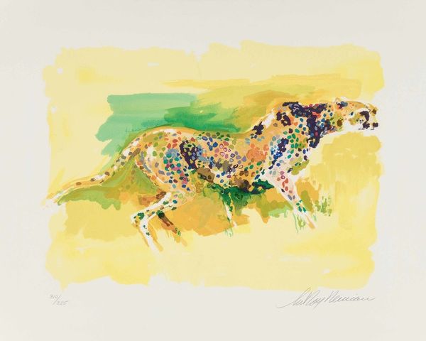 Curator: LeRoy Neiman's "Bull Elephant," painted in 2004, presents an interesting depiction of wildlife. What's your initial reaction to it? Editor: Chaotic, yet captivating. The vibrant colours shouldn't work on an elephant, but somehow they give it a sense of energy and presence. I’m drawn to how the artist manages to create such a textured surface with seemingly simple brushstrokes. Curator: Neiman's work often captures dynamic subjects. In this case, the elephant, an animal already laden with symbolism regarding memory and strength, is further animated through his characteristic bold style. How do you interpret his particular artistic choices in representing this animal? Editor: The brushstrokes! Notice how they're almost independent entities, building form but also disrupting it. It creates tension between representation and abstraction, fitting, considering the subject is the wild. The way the eye is rendered particularly arrests me; it has life. Curator: Absolutely. This piece reflects Neiman's broader approach, rooted in popular culture, from sports figures to wildlife, and suggests the public's fascination with the wild, in a style influenced by Abstract Expressionism, it makes the work accessible and engaging. Don't you think? Editor: Yes, I can certainly see the mark of expressionism in how emotion and feeling seem prioritised. The way that elephant almost stares back challenges us as observers. Is the focus about the animal or perhaps us as viewers? It almost dissolves traditional form. Curator: Ultimately, "Bull Elephant" serves as a fascinating example of how social interests and artistic innovation converge. The piece also says much about the shifting views and increased focus on wildlife protection around the turn of the 21st century. Editor: I agree! Considering its vivacity, I think Neiman's bull leaves a resonant trace, in memory of viewers and in painting traditions as a whole.