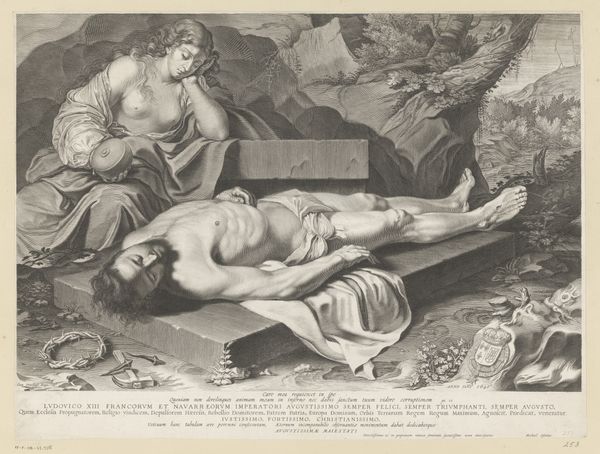 Curator: This is Michel Dorigny’s “Lamentation of Christ,” an engraving dating to 1644, a powerful piece rendered in the Baroque style. Editor: Woah. It’s somber. Really somber. All these lines… It feels like a whispered tragedy frozen in time. Like someone caught in the very moment of their deepest grief. Curator: Exactly. Dorigny’s depiction really leans into the emotional intensity characteristic of Baroque art. Consider the historical and religious context: This imagery of the dead Christ resonates deeply within Christian theology, marking the transition between sacrifice and resurrection. Editor: That explains why Mary looks so bereft. Her gaze and gesture seem like a desperate plea. Almost accusatory towards the heavens. You can almost hear her. I wonder if Dorigny ever felt this level of despair… losing someone like that? Curator: Grief is a universally shared experience, but for centuries, particularly within religious and academic circles, images such as these provided very clear instructions on *how* to perform mourning correctly and with adequate displays of emotional anguish. Editor: Interesting...It's almost performative, yet her suffering still feels visceral. The engraver's so precise. You can almost feel the cold marble beneath Christ's body. I can't stop looking at His face... He looks so still and resigned... almost peaceful. Curator: Note how Dorigny employed light and shadow to enhance the dramatic tension. Baroque artists very often used this contrast to emphasize certain aspects and provoke an emotional response, and it can be seen as an incredibly effective artistic choice. Also observe the textual component below, another strategy used in historical printmaking to provide relevant information. Editor: I appreciate that it shows both physical death and emotional response together so nakedly. It's intense... a moment stretched between agony and the unknown. It just hits you in the gut, you know? A glimpse into humanity in extremis. Curator: Indeed, its enduring power speaks to art's ability to represent complex human experiences across eras. It definitely makes you think. Editor: Absolutely, thanks for giving me a broader framework through which to see this art!