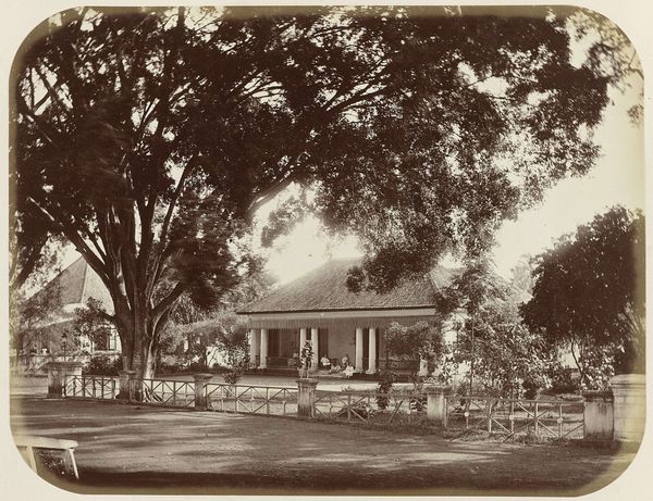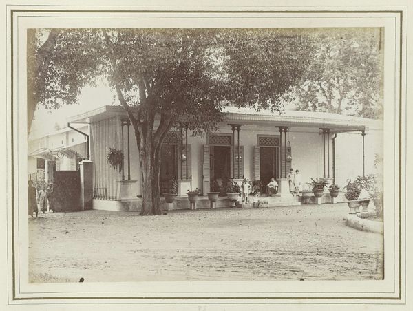 Kassian Céphas made this photograph, titled "Huis met koets en ruiters", with albumen print. The photograph presents a structured scene with its ordered horizontal and vertical lines. The veranda, with its evenly spaced columns and clear roofline, dominates the middle ground. The strong diagonal lines of the path, which is bisected by a lighter tone, create depth and lead the eye into the composition. What's intriguing is how Céphas uses the interplay of light and shadow. The light is not merely functional, but a formal device that articulates the shape of the building, the texture of the trees, and the subtle gradations of the landscape. The photograph’s meticulous organization may invite us to decode it as a system of signs, reflecting the complex interplay between colonizer and colonized during the period. Consider how this early photograph, through its meticulous composition, becomes more than a visual record. It functions as a cultural document, prompting us to consider the structures of power, representation, and historical narrative embedded within its frame.
