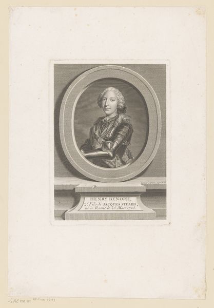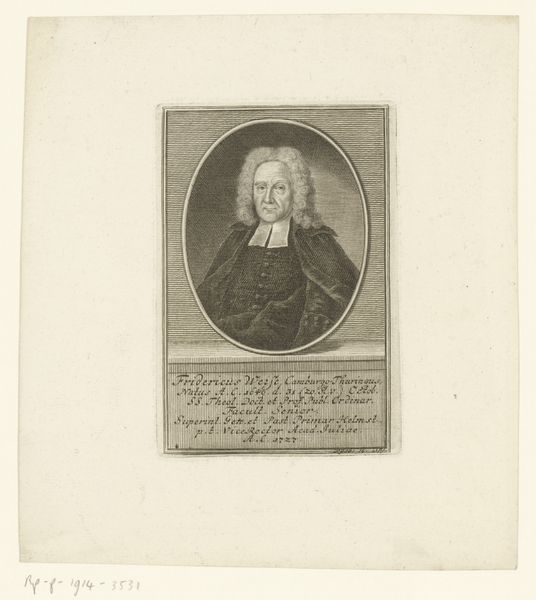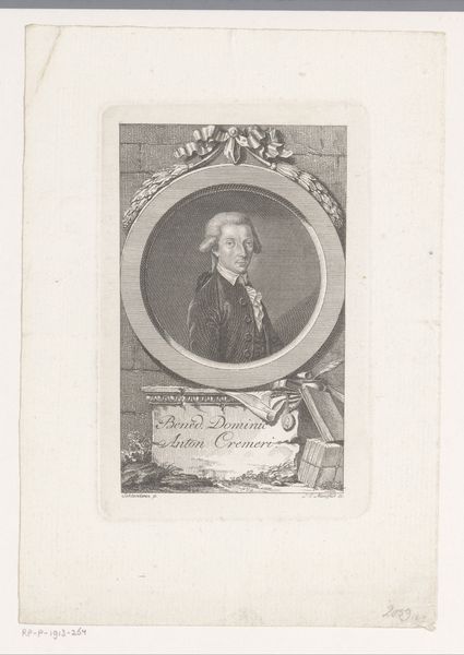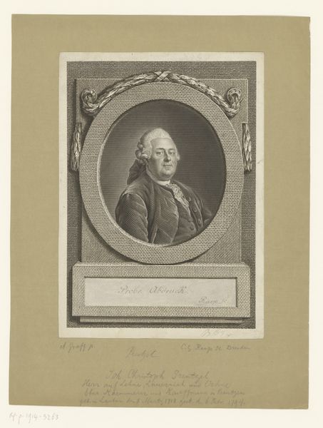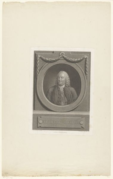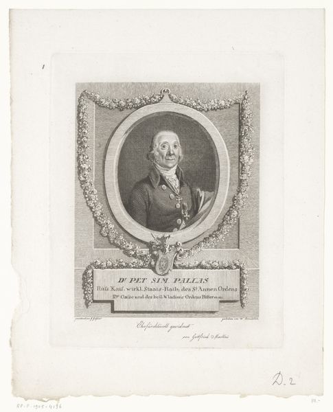 Curator: Let’s discuss this engraving, "Portret van P.G. Sage," dating back to somewhere between 1754 and 1809 and residing here at the Rijksmuseum. It's a fascinating piece by François Hubert. Editor: My first thought? Order and quiet confidence. The oval framing creates a sense of intimacy, a window into the life of this individual. He appears contained and secure. Curator: Absolutely. Hubert was operating in a time heavily influenced by portraiture and history painting, and you can see elements of the baroque period informing its structure and style, particularly in the decorative flourishes around the central image. P.G. Sage, judging by the inscription, held positions in several learned societies. What kind of power dynamics might Hubert have been exploring by depicting Sage in this particular way? How might Sage’s position in society impact perceptions? Editor: It certainly invites that interrogation, doesn’t it? Given the man’s stature as part of elite academies across Europe, I suspect it’s playing into existing tropes about male intellectual authority. The inscription certainly underscores Sage’s connection to powerful institutions of knowledge, both affirming and perpetuating such an exclusive power structure. Curator: And the material itself--an engraving--suggests something too: wide distribution and replication were perhaps key intentions from the start, making it very different from a singular painted portrait hanging in someone's home. Who was the intended audience for these reproductions, and what ideas and beliefs about scientific authority were being disseminated through its wide distribution? Editor: A vital question! Did this imagery challenge or reinforce specific class or gender norms of that era? What impact might it have on someone marginalized in those very spaces that Sage held membership in? A constant awareness of the image’s influence in and beyond the art world is paramount for an ethical consideration. Curator: Precisely. By investigating the political undertones within apparently traditional works, we gain essential perspective not only on the period in which Hubert operated, but hopefully insight on our own world, too. Editor: Definitely. Even an image as simple as this encourages us to confront questions of legacy, knowledge, and power across time.
