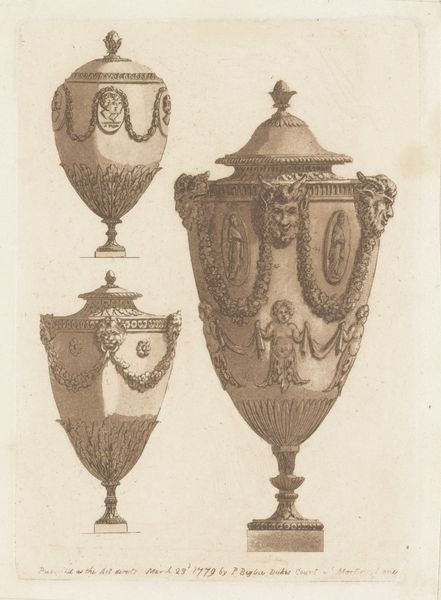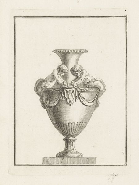 This ‘Geornamenteerde kan’ or ornamented jug was produced by Georg Friedrich Schmidt in 1774, using etching, a printmaking technique. The jug is depicted with incredible detail, and it's clear that Schmidt was attentive to the ways in which this kind of object was produced. To create an etching like this, an artist covers a metal plate with a waxy, acid-resistant ground. They then scratch an image into the ground with a pointed needle, exposing the metal beneath. When the plate is dipped in acid, the exposed lines are eaten away, creating an incised design. The deeper the lines, the more ink they hold, and the darker they appear in the final print. Schmidt uses this technique to great effect here, varying the weight of the lines to suggest light and shadow, and to create a sense of volume and depth. The result is a print that captures the jug's material qualities, its smooth, reflective surface, and its intricate ornamentation. It's a testament to the skill of both the object’s maker, and Schmidt himself, who could translate the jug's three-dimensional form into a two-dimensional image.