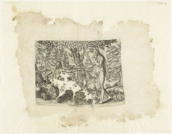 Curator: Let’s delve into this engraving, Adam and Eve, made around 1585-1596. The artist is unknown, which raises immediate questions about authorship, intention, and access. Editor: It’s such a stark depiction using line work; quite detailed despite the obvious age of the work. How do you interpret this piece through the lens of history? Curator: The representation of Adam and Eve is particularly interesting considering the historical context. During the late 16th century, theological and societal norms heavily influenced artistic representations. We often see them idealized. But let's look closer: who benefits from portraying Eve in this way? How does the serpent function here, not just as tempter, but as a symbol of knowledge – dangerous knowledge perhaps? What does it mean to frame her decision as the downfall of humanity and who does this narrative serve? Editor: I never thought of it that way; it is striking how she is still often held accountable. In your opinion, why have art pieces on this scene remained relevant? Curator: Because it isn’t *just* about Adam and Eve, it is also about systems. These representations underscore societal power dynamics, gender roles, and the control of knowledge, all highly relevant discussions today. Considering, the lack of a known artist further complicates this because anonymity itself suggests certain socio-political power structures. Editor: So anonymity suggests the structures themselves at play? Curator: Precisely. Even the act of interpreting such works becomes an intervention. What does this make you consider about current, similar art? Editor: Understanding these historic influences makes me wonder about my responsibility as someone interpreting art today! Curator: And hopefully motivates you to explore further! Examining art through this kind of critical framework allows us to unpack hidden assumptions and challenge established power structures.