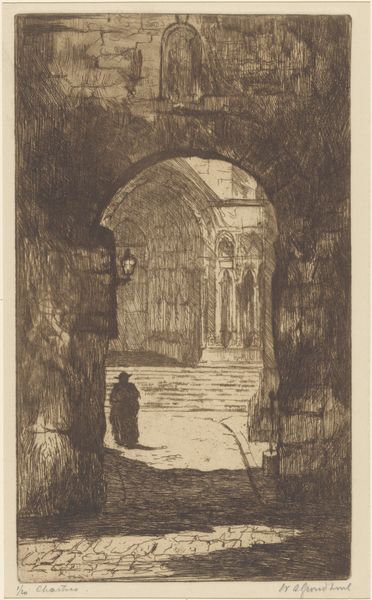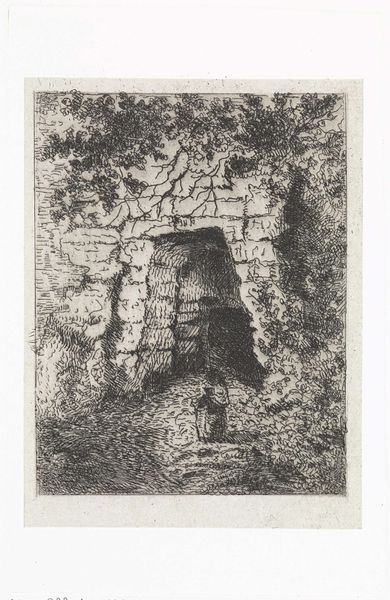 This etching, titled 'Gewelf met bewaker', was created by Arnoud Schaepkens in the 19th century. Schaepkens, born in Maastricht, lived through a time of significant social and political change in the Netherlands. Here, we see an intimate, almost secretive scene of a guard standing watch before an arched doorway. Consider the role of the guard as a figure of authority, tied to both protection and control. The image evokes a sense of enclosure but also the possibility of entry, transition, and the unknown. What is he guarding? The stark contrast between light and shadow creates a sense of drama, inviting us to contemplate what lies beyond. The work prompts us to think about the stories we tell about safety, security, and what we choose to keep hidden. Consider the emotional weight it carries, particularly the tension between safety and restriction.