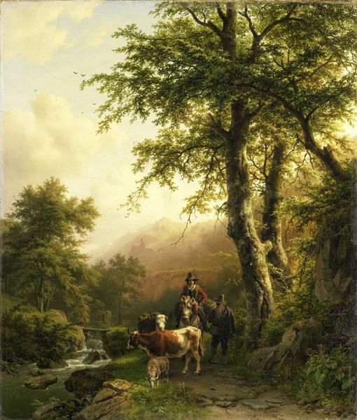 Curator: Edwin Landseer may be best known for his paintings of animals, but his portrait, “Queen Victoria at Loch Laggan” brings his royal patronage into sharp focus. The Queen is featured on the right, near a small group including bagpipes, her family and two ponies laden down. What stands out to you first? Editor: It is truly charming. There’s a kind of luminous softness about the color palette and the misty blues of the landscape that draws me in. It gives the whole composition a sense of dreaminess. Curator: Dreaminess, yes. But also, I think, a staged sense of informality. Landseer had a close relationship with the royal family and in many ways helped shape public perception of Victoria. There is no official record of such visit made to the highlands though the painting presents one. What do you think he's communicating here? Editor: The way Landseer manipulates the light and shadow—it's quite strategic. The light catches Victoria and the children in such a way as to almost separate them from the rugged terrain, it definitely idealizes their image in the scene. It subtly elevates the figures of power over nature. Curator: Exactly! This image really speaks to the rise of celebrity culture. Victoria became an incredibly influential figure, but also a pop culture icon. And how art, in the era before accessible photography and digital media, solidified images in the public imagination. It's clever how Landseer used light. Editor: For sure, if we just look at form—see how the horizontal lines of the landscape, and the figures, work to give the piece a grounding sense of calm despite the staged tableau. What do you notice? Curator: That makes me think more broadly about the politics of display: about how images such as this played a pivotal role in visualizing the British Empire, both for those living within it, but especially those ruled by it. The family is painted in harmony with their Scottish landscape. Editor: It certainly invites us to reflect on that relationship between image, power and nature! Thank you for these interesting contextualizations of Edwin Landseer. Curator: Absolutely. And for me, this reminds us of the ways the Victorians helped set many standards of art practice, the image-making, and royal representation with which we still reckon.