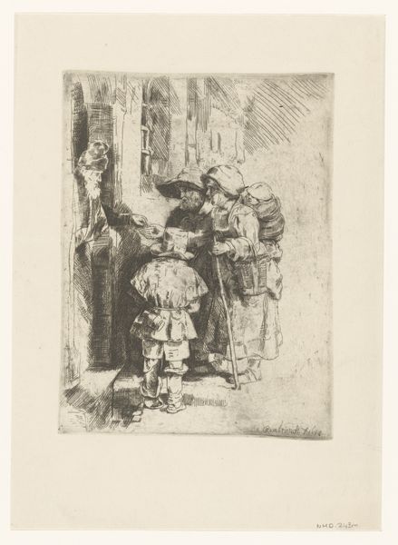 Curator: Rembrandt van Rijn's etching, "A Blind Hurdy-Gurdy Player and Family Receiving Alms," dates from between 1648 and 1906 and is now housed at the Rijksmuseum. The composition feels heavy, weighted down by hardship. The family, shrouded in shadow, presses forward. Is that weariness I detect? Editor: Yes, and beyond weariness, I see resilience etched into the lines of their faces. Note how Rembrandt used the etching technique here; it's not just about representing a scene, it's about conveying texture. Consider the coarse garments of the family, juxtaposed with the finer clothing of the almsgiver. Curator: Precisely. The economic disparity is palpable through the meticulous rendering of fabrics. This connects directly to Rembrandt's position within the Dutch Golden Age; his works are commodities as much as they are artistic expressions. The production of etchings like this enabled a wider audience to engage with art. Editor: I'm also struck by the layered symbolism. The hurdy-gurdy, traditionally associated with itinerant musicians and often the poor, becomes a potent symbol of vulnerability and dependence. The figure giving alms – what does that gesture of charity signify? Curator: We need to analyze that figure through the lens of the materials depicted. His darker garments and heavier build might point to affluence. His generosity underscores his position and is materialized by those actual coins exchanged. Rembrandt emphasizes not just social commentary, but the physical act of giving and receiving. It’s very tangible. Editor: But beyond material analysis, look at the architecture itself. That darkened doorway is not only literally an entrance or a stage. Isn't it suggestive of uncertainty and reliance on something, or someone, outside themselves for comfort and hope? Rembrandt has rendered these potent allegorical ideas, using these familiar tropes to elicit feeling from his audience. Curator: So we see both a socio-economic situation presented and a collection of iconographies intended to inspire an empathetic reading, both intertwined because Rembrandt, as the producer, both comments upon his present day whilst considering art history's role to move viewers to moral reckoning. I am interested to study the watermarks of other etchings of this era now. Editor: I leave today pondering what other untold visual narratives await those willing to really look at familiar imagery.