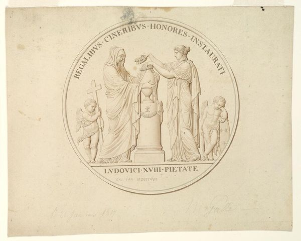 Editor: This is André Galle's "Design for a Medal: The Entry of the Duc d'Angouleme in Madrid." It has such a classical, almost propagandistic feel. What can you tell me about the historical context of this piece? Curator: Absolutely. The design commemorates a specific political event, the Duke's entry into Madrid, but it's also participating in a larger project of legitimizing Bourbon rule after the Napoleonic era. Editor: So, it's about crafting a specific image? Curator: Precisely. Note the Latin inscription "MATRITVM LIBERATVM" - Madrid Liberated. It uses classical imagery to portray the Duke as a bringer of freedom, even though the reality was likely more complex. What do you make of that? Editor: That it is indeed a powerful piece of propaganda, but knowing the history helps to decode the message. Curator: Exactly! It highlights how art serves the socio-political narratives of its time.