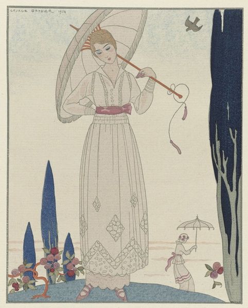 Gerda Wegener made Amor with a Victim with watercolour, but it’s the graphic lines which catch my eye, like a fashion illustration. The application of the paint is so thin, almost like a stain, allowing the paper to breathe. It's as if the image is more about the idea of colour rather than colour itself. The dragonfly, the umbrella, the dress, all rendered with an economy of means, but still so vivid. Check out how Wegener uses the black lines to define shapes, like the trees with strange round fruit, or the woman's silhouette. These lines aren't just outlines; they have their own weight and rhythm, creating a sort of dance across the surface. Reminds me a little of Matisse’s line work, but with a touch of something darker, maybe Egon Schiele. It’s like she's mapping out a world where beauty and danger are always intertwined. Love it.