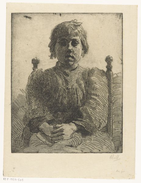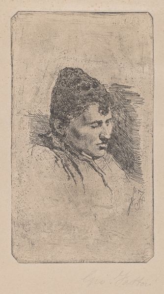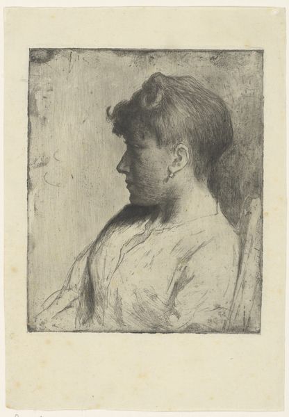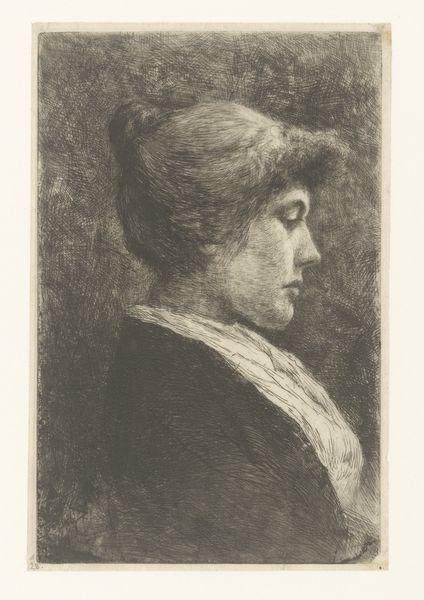 Curator: This is Philip Zilcken’s "Portret van een vrouw, en profil," created between 1867 and 1890. It's an etching. Editor: The immediate impact is the subtlety of the tones, a hushed quietude emphasized by her averted gaze. There’s something very vulnerable in it. Curator: Note the remarkable control of line and value, which lends the piece its distinctive graphic quality. The parallel hatching is strategically deployed to create tonal variation and form. The artist employs etching techniques masterfully. Editor: How do you think this echoes broader class issues of that time? The profile view was popular for formal portraiture, but it could also represent the objectification of women by only displaying a limited or curated version of the sitter to a primarily male audience. Curator: Perhaps. However, the formal restraint of the profile is less about reducing the subject, and more about formal clarity. By limiting the available visual information to a side view, the emphasis is drawn towards form and line and structure. Editor: Right, but by choosing etching, a readily reproducible method, there's an argument to be made for accessibility of portraiture, especially considering portraiture was typically reserved for the elite, so that adds a layer to her overall visual presentation. Curator: One can easily look past social theory to note Zilcken’s mastery over line to portray both solidity and atmosphere simultaneously. Editor: Still, dismissing the broader narratives would overlook so much depth of characterization! Curator: Even while examining line and light, context always deepens how we approach these portraits. Editor: Ultimately, though, the work stays with us—with lingering questions about representation.