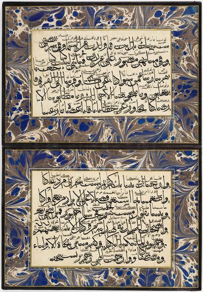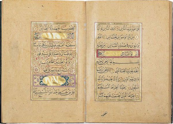 Curator: Look at this gorgeous Qur'an folio, likely crafted by the scribe Al-Hajj al-'Arif. It presents Suras 107 through 114. Editor: It looks so intimate. The size is modest, and the script is compact, making it feel very personal. I wonder what it meant for its original owner? Curator: The text is so carefully rendered and framed, suggesting a profound reverence. The script itself is a visual echo of the divine word. Editor: Absolutely, the script and illumination elevate the spiritual experience. But I also wonder, how did societal structures of power affect its creation and use? Who had access to such a beautiful object? Curator: That's a good point. Manuscript production was a complex process, so it likely involved a patron with resources, reflecting social stratification even in sacred contexts. Editor: Exactly, even devotion has a history. Understanding that context helps us appreciate both the beauty and the social dynamics at play. Curator: Seeing the historical and devotional symbolism interwoven like this makes it all the more meaningful. Editor: Yes, and it challenges us to consider the layers of meaning that art can hold.