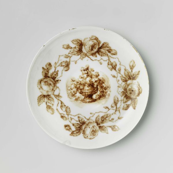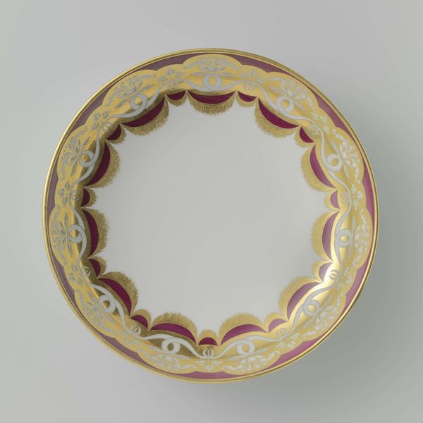 Curator: Here we have a hard-baked earthenware plate made by Charles Meigh around 1840 to 1860. Notice the purple and gold decoration. What’s your initial take on it? Editor: It's unexpectedly bold! That contrast, you know? Black and gold can lean stuffy, but there's a playful energy here. I think because the detailing is very floral, almost naive in its representation. Curator: The decoration is certainly eye-catching. This aesthetic was very popular during the mid-19th century as ceramics grew more ornate. Notice the concentric rings of design – a band of stylized floral motifs around the edge, echoing the more intricate medallion in the center. Editor: It makes you wonder what kind of social context birthed a plate like this, right? Were folks eating fancy puddings off it or just showing off in cabinets? It strikes me as something of value, something to cherish for years to come. Curator: Exactly. The plate almost becomes a little time capsule in this sense. Ceramics, especially fine earthenware, played a crucial role in Victorian domestic life. This was more than just a functional object, but also an expression of wealth, taste, and cultural refinement. Editor: Absolutely, and those colors – the gilded touches against that almost goth purple-black – must have made such a visual statement at the time. There’s a real flair for drama. Curator: Indeed. Gold leaf, here, does not only signal material worth, it carries a symbolic meaning of illumination, perhaps a nod to the increasing wealth of the era, reflecting an optimistic future. It also reflects the impact of gothic and neo-gothic architecture throughout design from this era, particularly in the pointed shape and detail in the design. Editor: Looking at the level of craft involved... It really does invite you to imagine those Victorian-era tea parties, a blend of conversation, delicious cakes and... silent judgements. Curator: Ha! Exactly. It is that interesting mix of beauty, wealth, social cues, all packaged together. Editor: I suppose in the end, that is the enduring appeal. Something beautiful is also full of stories waiting to be unlocked, don't you think? Curator: Absolutely, stories embedded in material culture, available for us to imagine, to project onto, and perhaps, learn a bit about ourselves.