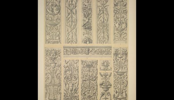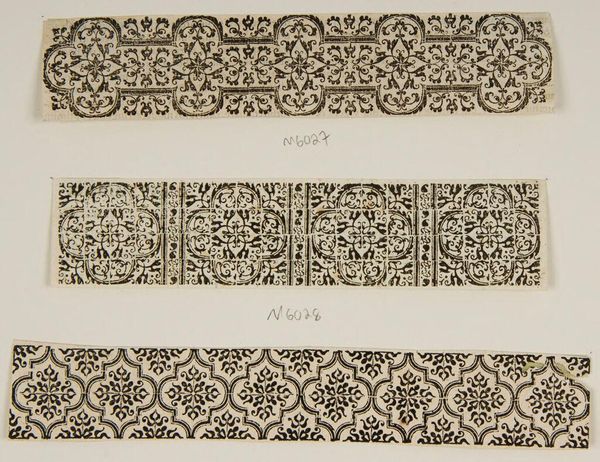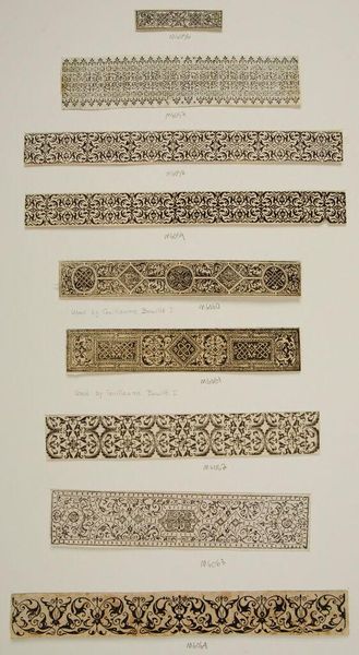 Curator: Here we have a series of five borders, simply titled "Border," crafted by an anonymous artist. They reside in the Harvard Art Museums. Editor: These linear designs seem incredibly intricate, almost dizzying. There's a density to the line work that's quite striking. Curator: Indeed. These borders likely served as decorative elements in books or manuscripts. Notice the recurring motifs—grotesques, foliage, and heraldic devices—reflecting the artistic conventions of the time. Editor: The way these motifs are interwoven creates a rhythm, a visual pulse. Some sections feel balanced, while others burst with chaotic energy. Curator: It's interesting to consider how such designs reinforced status. These borders elevated texts, adding a layer of prestige accessible only to a select audience. The imagery chosen communicated power and societal values. Editor: The varying widths of the lines give depth and texture, especially when you realize that this probably was meant to be seen in small scale. I can almost feel the pressure of the tool. Curator: Absolutely. It offers a glimpse into the cultural values embedded within these printed materials. Editor: I am left admiring the balance between ornamentation and functionality.
