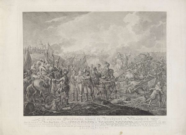 Editor: This is "Ruitergevecht" – or "Cavalry Battle"– an engraving by Jan van Huchtenburg, made around 1702. It's incredibly detailed, showing a chaotic battle scene. What strikes me is the sheer energy of it, even in this black and white print. What do you see in this work? Curator: Oh, it's more than just energy; it’s controlled chaos! I imagine Huchtenburg sketching furiously, trying to capture the frenetic dance of war. Do you notice how he uses light and shadow – or rather the *suggestion* of it – to create depth? It's almost theatrical, isn’t it? Think of a baroque opera set on horseback! Beyond the dynamism, there's a subtle commentary, perhaps on the futility or even the brutal beauty of these clashes. What do you make of the tiny figures in the background? Editor: That's interesting! I hadn’t considered the theatrical aspect, but it does have that heightened, dramatic feel. The figures in the back seem almost… indifferent? Like this grand battle is just part of the everyday landscape. Curator: Exactly! Are they ignoring the conflict, or are they resigned to it? It makes you wonder about the bigger picture, doesn't it? The artist presents this intense moment of combat and this tranquil countryside, perhaps pointing out how war and violence contrasts with this environment. What feelings does the picture spark in you now? Editor: It makes me think about the contrast between the individuals fighting and the wider impact on the land and the ordinary people living there. All that upheaval distilled into a single, frenetic scene. It gives you much to think about. Curator: Absolutely. It's like a freeze-frame of history, brimming with drama and subtle melancholy. There is incredible detail in an unrefined art medium. Perhaps those two concepts go together naturally!