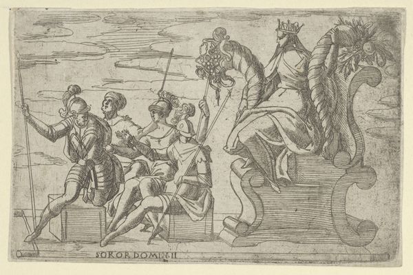 Editor: This is “H. Bonosa,” an engraving by Antonio Tempesta, made sometime between 1565 and 1630. It’s quite small, but intensely dramatic, with so much happening in a contained space. What symbolic significance might you find in this kind of scene? Curator: An engraving like this acts as a vessel, doesn’t it? Filled with the stories and beliefs of its time, like cultural memory made visible. The image portrays the martyrdom of Saint Bonosa. The flaying hook to the left indicates earlier torments. Her unwavering faith is visualized as the halo surrounding her head, a visual shorthand for divine grace, even as the figures around her attempt murder. What emotions are stirred in you when considering how the divine is expressed here? Editor: It's interesting how even with violence, there’s still an effort to show her holiness through that halo. The action contrasts starkly with the serenity they’re trying to convey. Curator: Precisely. The halo, almost like a brand, ensures the reading of the image, solidifying the saint’s narrative within a very specific visual and theological framework. These kinds of symbols offered a continuous thread of meaning across generations. We are meant to both recognize and remember a very specific understanding of sacrifice and faith. Is there a more modern equivalent you can think of? Editor: I suppose the visual language of propaganda shares some common goals, ensuring messages are easily recognized and remembered through potent symbols and visual cues. Curator: Indeed. These images became ingrained within the culture of the time, influencing the viewers to embody certain values and beliefs associated with those symbols. Thank you, this offers us all an important perspective.