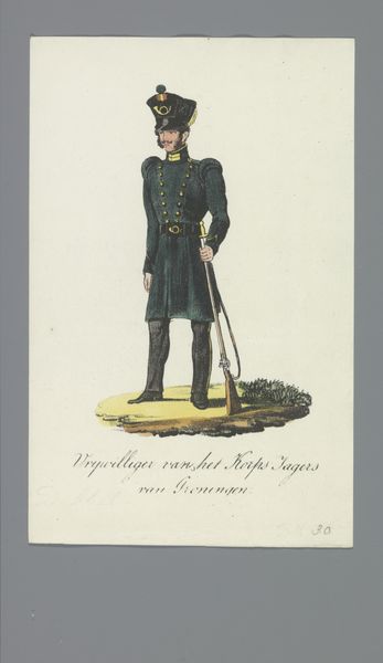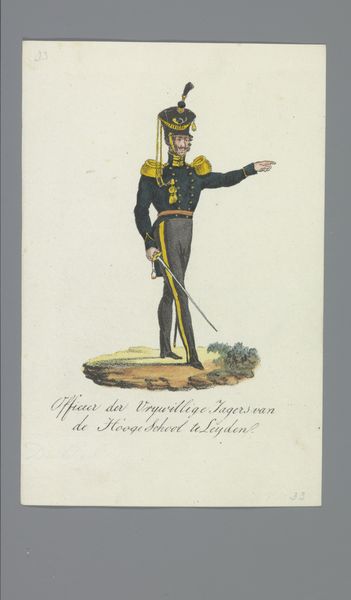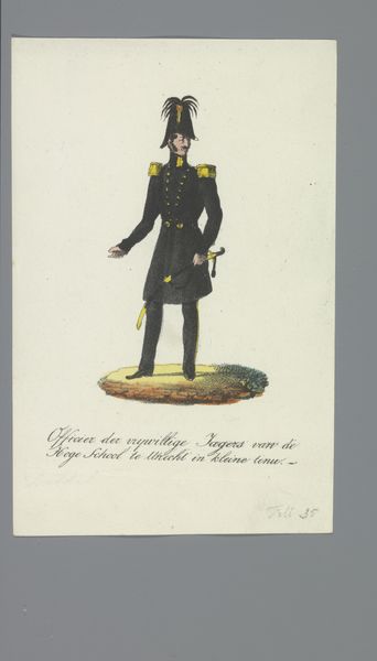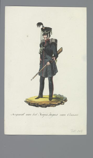 This hand colored print by Albertus Verhoesen depicts an officer of the Volunteer Corps, a cavalry unit active in the Netherlands in the early 19th century. The print offers a glimpse into the social and political complexities of the time. Volunteer corps were formed by citizens during periods of unrest, as a means to maintain order and defend against external threats. The officer’s identity is tied to his class and civic duty. His ornate uniform reflects his status and the expectations of his role. The sword at his side suggests the potential for violence, reflecting the turbulent climate in Europe after the French Revolution. This image prompts us to consider the dynamics between individual identity, civic responsibility, and military power, and the tensions that arise when citizens take up arms in the name of order and security.