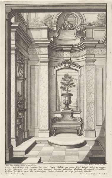 Curator: What a find! This is “Antiquiteitenzaal,” an etching and engraving by Balthasar Sigmund Setletzky, dating from sometime after 1724. It depicts a room brimming with antiquities. Editor: My initial thought? Restrained opulence. All those perfectly lined up columns recede into the distance, but there’s an almost clinical precision to it, wouldn't you say? Curator: I feel that clinical eye too, though "dreamlike" also springs to mind. Notice how Setletzky uses the stark contrast between light and shadow. The arch at the front gives it the feel of peering into someone's memory, or perhaps a stage set. The lighting, especially around the statue at the center, lends it a rather theatrical atmosphere. Editor: Right, because this isn’t just a room; it’s a declaration, isn't it? These “cabinets” overflowing with Cariguan and Memorabilia scream empire, legacy… maybe even an anxiety about how these relics are being arranged. Who controls the narrative, eh? Is this knowledge, or curated power? Curator: A loaded question! Perhaps the work explores just that – the power dynamics inherent in collecting and displaying historical objects. Remember this was a period of great European expansion and colonial acquisition, wasn’t it? This antiquities hall probably signifies an effort to comprehend and, maybe more problematically, to control, an expanding understanding of the world. The piece makes me consider how collections of artworks and objects have the potential to simultaneously broaden our perspective while narrowly representing culture and the historical context of said culture. Editor: Exactly! I appreciate how it demands that we ask difficult questions about the motives of its arrangement. Is it preserving history or dictating it? Curator: In this context, its easy to see how these objects tell their own tales – perhaps, as they exist alongside and even contradict their original sources! A single work, a portal. Editor: Yes, truly, who decides what makes its way inside and out of the frame.
