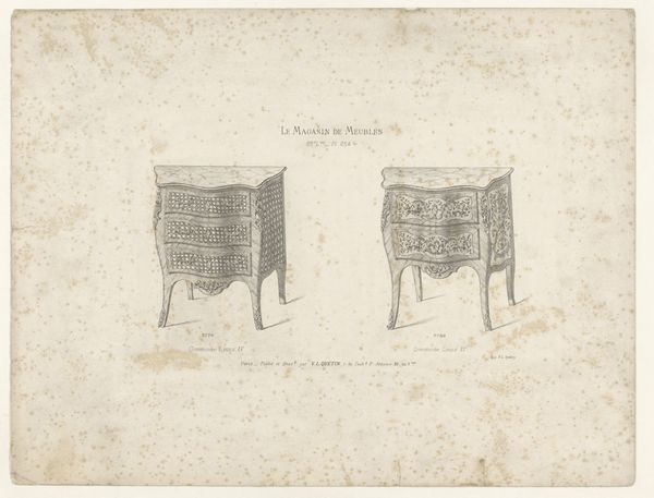 Curator: Here we have "Highboy-front and Side Views," a watercolour drawing on paper by Fred Weiss, dating from around 1936. Editor: My initial feeling is one of restrained elegance. The pale hues create a rather serene composition, almost architectural in its precision. Curator: Indeed. It’s fascinating to see this level of detail rendered in watercolor. Notice how the artist meticulously outlines every drawer, knob, and curve, highlighting the cabinetmaker’s skill. The work really highlights the production aspect and almost worships it. It makes me consider what sort of audience Weiss wanted. Was this to market high-quality materials? Editor: It certainly prompts me to ponder the symbolic significance embedded in the form. The Highboy, particularly with its height and multiple drawers, suggests a hierarchy, compartments within compartments. It feels almost like a visual representation of the human psyche—layers of consciousness and hidden depths, or even just a place to hide precious heirlooms from children! Curator: And look at the material choices. Paper, watercolour—these aren't precious metals or oils on canvas, and instead very domestic, accessible materials. This almost flattens the space between craft and high art. The act of representation democratizes the original artisanal object itself. The work is the focus, rather than simply an indication of wealth or prestige. Editor: The central floral motif resonates deeply. A subtle mandala presiding over the more utilitarian drawers, evoking themes of beauty and prosperity and a gentle domestic bliss, perhaps even subtly signaling to feminine themes of decoration within a household. Curator: It’s really striking how such an everyday item becomes almost a symbol itself. These sorts of utilitarian structures create and sustain human societies; their materials tell their stories, stories that are then reflected in these watercolors. Editor: Yes, after seeing these considerations, I now feel a sense of something quietly complex behind what might seem, at first glance, rather subdued. Curator: Agreed. A quiet observation can open a world of social and material realities.