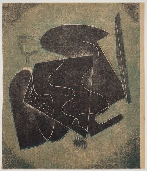 Dorr Bothwell made this color screenprint, titled "Exhibition," sometime in the mid-20th century. The palette is restrained, mostly olive green, brick red, and slate blue; a harmonious balance that gives the piece its distinctive, mid-century vibe. The print is an intricate dance of abstract shapes. Notice the slender red form on the left, resembling a highly stylized tool. The texture is flat, a quality achieved through the screen-printing process, but each shape hums with its own energy. I find my eye drawn to the white, crescent-shaped eye. It sits atop a table-like shape that seems to balance the whole composition. This feels connected to the work of Joan Miró, but maybe with a touch more restraint, a more subdued sense of humor. It invites us to contemplate the nature of perception, perspective, and the playful possibilities of abstraction.
