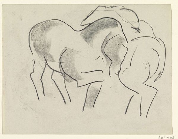 Leo Gestel made this drawing, Twee koeien, with pencil, probably sometime in the early 20th century. Look at how the two cows are rendered with just a few, confident lines. There’s such an economy of means here; Gestel wasn't interested in showing us every detail, just the essence of "cow-ness." It's like he's saying, "Here, I'll give you the bare minimum, and you fill in the rest." The physicality of the medium is really apparent. You can almost see the artist's hand moving across the paper, deciding where to commit and where to leave things open. Take that one line defining the back of the larger cow; it's not perfectly smooth, but has this little wobble that gives it so much character. It reminds me of Picasso’s line drawings, where a single contour can convey so much volume and presence. It's all about suggestion, leaving space for the viewer's imagination to roam. Gestel seems to be having a conversation with artists across time, exploring the possibilities of line and form. It’s a reminder that art is always in dialogue, constantly reimagining what’s possible.