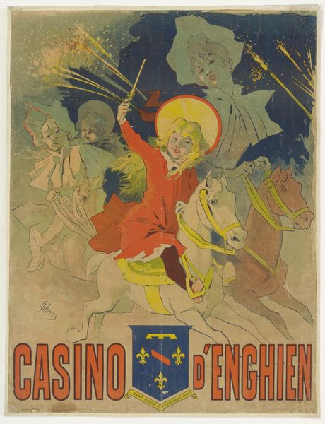 Editor: This lithograph poster, titled "Théâtre De L’opéra," was created in 1895 by Jules Chéret. It seems to capture the energy and excitement of a theatrical performance, perhaps a carnival. I’m curious to know what other stories or historical contexts you see embedded within this image. How do you interpret this work, particularly in its relationship to public life and spectacle? Curator: It's important to see these posters within the broader explosion of mass media at the turn of the century. How did new technologies like lithography impact the visual culture and shape the rise of consumer society? These weren't just advertisements, but really tools of persuasion. And this image serves not only as advertisement, but presents a glimpse into the cultural significance of the Opéra and carnival celebrations in shaping public identity and urban life in late 19th-century Paris. The vibrant colours and dynamic composition seek to attract and invite people, but who are those people? What audience is being addressed by this imagery? Editor: It’s like the poster is selling not just the event, but the idea of Parisian high society and the experience of participating in it. Is there a kind of "politics of imagery" at play, a narrative or set of assumptions being presented about class or status? Curator: Exactly! Chéret and other poster artists definitely played a key role in constructing and circulating those narratives. Posters shaped our image of an emergent consumerist and entertainment society. The poster operates within and reinforces certain ideas. By engaging critically with those depictions we start to understand their underlying assumptions and influence. Editor: It's fascinating to think of something as seemingly simple as a poster functioning as such a powerful cultural artifact! Thanks, it’s great to consider it this way. Curator: Gladly, it's about broadening our ideas of cultural products.