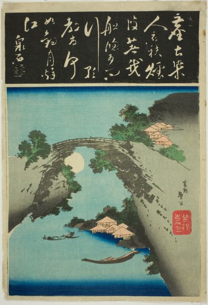 Editor: This woodblock print, "Kai Province, Monkey Bridge" by Utagawa Hiroshige, has such a striking composition. The bridge seems almost incidental to the powerful landscape. What can you tell me about the historical context of this work? Curator: Hiroshige's series helped shape Japan's national identity, promoting regional tourism and a collective sense of place. Consider how woodblock prints democratized art, making scenic views accessible to a broad audience. Editor: That's fascinating! So it was more than just art; it was a form of nation-building? Curator: Precisely! It used landscape to create a shared cultural experience. Notice how the exaggerated perspective emphasizes the grandeur of nature. Where do you think these images were displayed and by whom? Editor: Probably in homes, inns, or sold as souvenirs. I see now how it was so effective in shaping a national identity. Thanks! Curator: Indeed! The image and its distribution reveal as much about cultural aspirations as individual expression.
