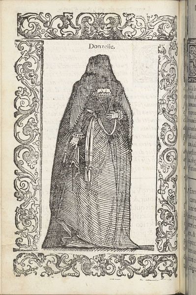 Editor: This is "Citella Ferarese," a 1598 print by Christoph Krieger. It's fascinating to see this figure depicted in what looks like an engraved format. It's making me consider how printed materials were perceived and valued at this time. What do you notice about this artwork, especially from a material perspective? Curator: From a materialist standpoint, this engraving throws into sharp relief the intersection of craft, technology, and social status. The very act of creating a print implies a certain level of mechanical reproduction – and dissemination of knowledge. The depicted attire suggests access to certain material goods, and through the engraving process, that very access is documented and circulated. It’s a carefully constructed image. Notice how the lines articulate not just form, but also the very texture of the fabrics. What can that level of detail tell us? Editor: It shows how important fashion was for portraying social standing. The engraver invested lots of labour into replicating all those little details of her garments…it implies both the wealth of the wearer and the skill required to reproduce it. The print becomes a kind of commodity itself. Do you think this challenges typical hierarchies between art and craft? Curator: Precisely. Consider how this print, and others like it, might have circulated. It's a document of status, yes, but also a tool. Could these prints function almost as fashion plates? Disseminating styles beyond the immediate elite. This makes one reconsider labor and how printed items impacted society. Editor: This has been incredibly enlightening; I hadn't thought about the connection between the details of clothing, material processes, labor and wealth until now. Curator: It’s precisely by looking at the materials and modes of production that we start to understand art's complex relationships with society, power and identity.