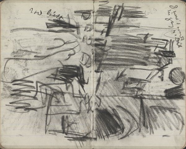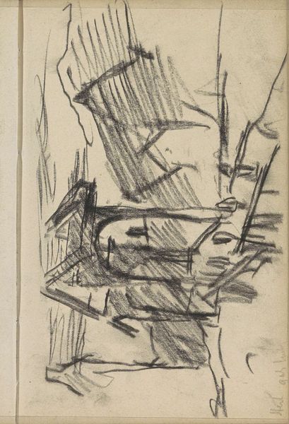 George Hendrik Breitner made this drawing, "Gezicht op een weg met een paardenkar," with black chalk on paper. The composition presents a flurry of lines and shapes, evoking a momentary glimpse of a street scene. The monochromatic palette amplifies the starkness and immediacy of the sketch. Breitner's marks articulate forms that coalesce into a horse-drawn cart and its surroundings. The sketchy quality and structural elements can be read through a semiotic lens. The lines and smudges act as signs, hinting at recognizable forms. The drawing has a certain energy in its rapid execution and captures a fleeting moment. Notice how Breitner uses line weight and density to suggest depth and movement. These are not merely representational techniques but also carriers of emotional and experiential information. Breitner uses the formal qualities of the medium to convey a sense of modern life. The fragmented nature of the composition invites the viewer to engage actively in constructing their own interpretation of the scene.
