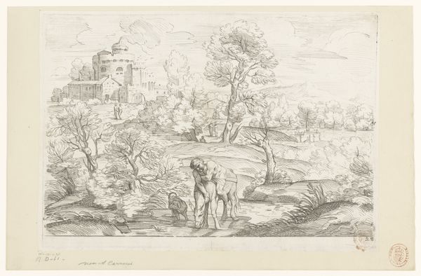 Editor: This is Cornelis Cort's "Italian Landscape," a print rendered in ink from around 1530 to 1578. The line work is just incredible. It gives the scene such a sense of vastness, even in such a small-scale work. What draws your attention in this etching? Curator: It's crucial to consider the material production itself. Etching allowed for the relatively easy replication of images, democratizing access to landscapes previously only available to the wealthy who could commission paintings. Consider the socio-economic impact of such reproduction. Do you think this increased exposure to different regions shaped trade and labor systems? Editor: That's a great point. I hadn't thought about how prints made imagery more accessible. Do you mean by making faraway places feel closer? Maybe encouraging travel or commerce? Curator: Exactly. Now, consider the labor involved. Etching was often a collaborative process, with specialized artisans contributing to different stages. Can we see any clues within the composition itself suggesting the influence of varied artisan contributions? How might that collaborative making influence how we appreciate the landscape genre differently than say an oil on canvas landscape by a single artist? Editor: It's subtle. It would take some deep research into printmaking during the Renaissance to know how this was made, to see those differences and who made what. But thinking of this as the result of different hands impacting what we’re seeing opens up all these questions about artistry and artistic labor. Curator: Precisely. By centering our focus on materials, processes, and social conditions, we reveal the layers of meaning embedded within what initially appears as a simple landscape scene. This reorients our gaze. Editor: I never thought I'd find this many layers looking at a simple landscape.