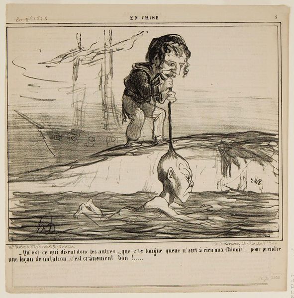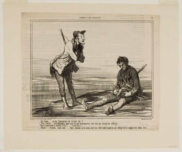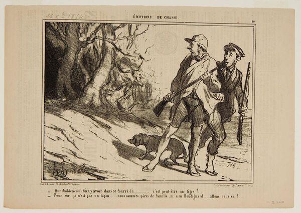 Curator: This drawing by Honoré Daumier, its title translating to, "Well then, Mr. Caboulot, aren't you coming? ...it's time to go home...", seems comical yet contemplative. Look at the cross-hatching! Editor: Yes, the lithographic marks speak to the printmaking process, but the work’s setting—a hunting scene and its leisurely class—is what I see first. This is about leisure, labor, and perhaps… exploitation. Curator: The composition's simplicity draws attention to the hunter’s pose and the tree’s texture. Daumier captures a moment of waiting, using line to convey light and shadow. Editor: And that waiting is borne of privilege, isn’t it? This isn’t just about aesthetics; it's about the social dynamics of 19th-century France. The materials available for leisure. Curator: Perhaps. Either way, a study in contrasts, visually engaging in its stark presentation. Editor: Indeed. A reflection on how class shapes perception, brought to life through simple lines.