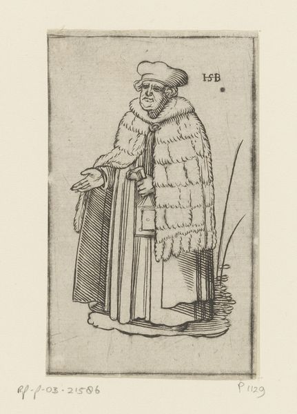 Editor: We're looking at "Monnik met haardijzer om de nek," or "Monk with curling iron around his neck," an engraving by Jacob Gole, from 1724. It feels a little satirical, like a commentary on the church, maybe? How do you interpret this piece? Curator: That's a sharp initial assessment! As a historian, I’m drawn to the cultural context. What statement could Gole be making about piety and the Church by portraying a monk, in full religious garb, carrying a curling iron like a holy relic? Do you think this print might have been commissioned or circulated during a time of religious upheaval or criticism? Editor: It could be! It definitely makes you think about the visual presentation of piety versus actual devotion. The monk’s elaborate robes and posture almost seem like a performance. Curator: Exactly! The choice of engraving as a medium is also important. Prints allowed for wider dissemination of images and ideas, particularly satirical ones. Consider who the audience might have been and what message Gole, and his publisher, might have been trying to convey through this accessible and reproducible format. Was it just humorous, or did it reflect wider sentiments? Editor: So it's not just about the monk himself, but the social context that gave the image meaning and power. I never thought about how the medium contributes to the overall interpretation, it is much more complex than I previously expected! Curator: Precisely! Analyzing art requires understanding the visual language of its time, its distribution, and its reception within society. Art is rarely created in a vacuum. Editor: That's a really helpful way of thinking about art history. I’ll remember to think about the bigger picture from now on!