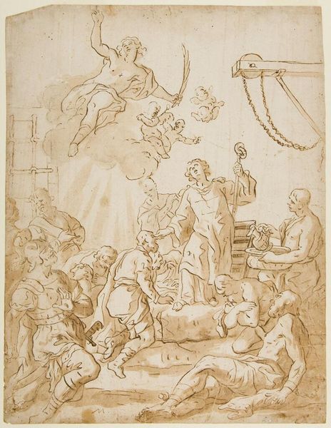 Editor: This drawing, "Birth of the Virgin," is by an anonymous artist. It's at the Harvard Art Museums. The sepia tones give it a sense of history and intimacy. What story do you think it's trying to tell? Curator: The image speaks volumes through its symbols. Notice the angels above, signifying divine intervention, contrasted with the earthly scene below. What feelings do the figures evoke, and how might those relate to the cultural significance of birth in this era? Editor: I feel a sense of reverence, maybe? Like, everyone is aware of the importance of this moment, both human and divine. Curator: Precisely! Consider the cultural memory embedded in this imagery – the hope, the promise, and the weight of expectation. It is a poignant reflection on cultural values, wouldn't you agree? Editor: Yes! It's fascinating to see how much meaning can be packed into one scene. Thanks!