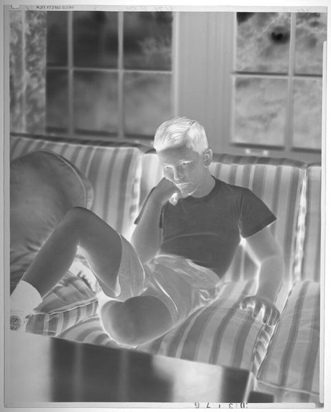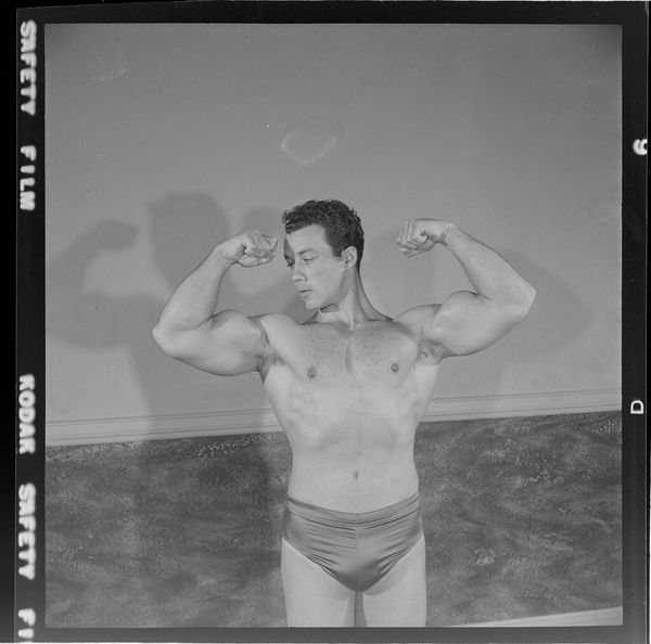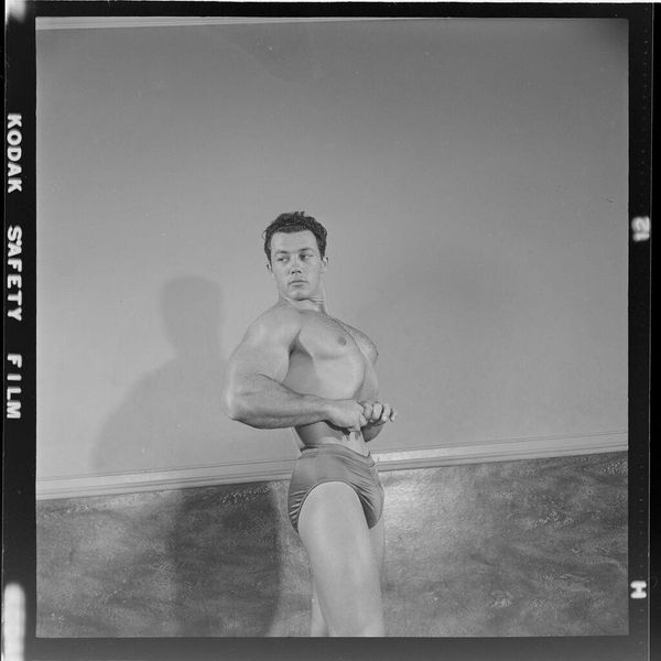 Curator: George Platt Lynes crafted this photographic portrait of Bernard Perlin in 1949. It’s a strikingly simple image, stark in its black and white composition. Editor: There’s a definite stillness here. Like the moment right after the curtain closes, and you're alone with your thoughts. Melancholy, maybe? Or just deep reflection? Curator: Lynes's work often explores themes of beauty and form, particularly within the male figure. Looking at this portrait, one can read it as an attempt to canonize male beauty in art history, moving it out of the periphery. He disrupts gender norms of art, highlighting the male body in a sensuous yet academic approach. Editor: I notice Perlin is wearing, or maybe half wearing, what seems like regular clothes and jewelry, juxtaposed against a semi-nude presentation, so it’s domestic, and strangely, also, very exposed and vulnerable. And that expression on his face! He seems to be searching for something. It adds to the emotional pull. Curator: Exactly. During that period, representing queer figures and eroticizing the male form could be viewed as subversive. So, Lynes’s photographic vision must also be seen within that social context. Considering Perlin was himself a figurative painter also invested in challenging the status quo, perhaps it could even be considered a type of double portrait. Editor: A collaboration then, almost a silent manifesto. I keep circling back to his expression. It feels incredibly intimate, almost as if he’s looking right through you while caught up in a dream. Curator: This photograph exists as a moment suspended between vulnerability and defiant presence, both anchored within historical, political and artistic dialogues of its time. Editor: It certainly holds your attention. There’s something quietly profound about the piece. It lingers.