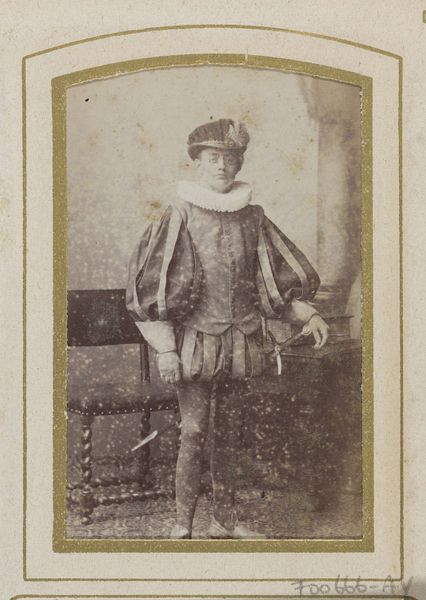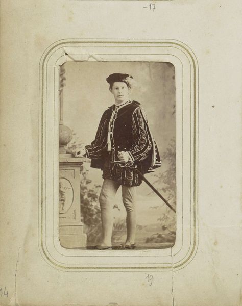 Curator: This fascinating albumen silver print dates back to the 1880s. It is a portrait from the "Actors and Actresses" series, created by W. Duke, Sons & Co. to promote Duke Cigarettes. The image captures Mattie Rogers, an actress of the time, in elaborate attire. Editor: My immediate reaction is one of curiosity. Mattie is adorned in what appears to be a military-inspired outfit, though something feels playful rather than strictly regimented about it. The scale is also quite striking, the print’s small format seems to give the actress an unusual sense of power. Curator: Exactly, and this print serves as an interesting example of how celebrity culture and advertising intertwined in the late 19th century. Consider how tobacco companies deployed popular figures, in this case a performer, to enhance their product’s appeal. The image circulated widely. Editor: It's compelling how the visual language is constructed. Her pose, her clothing, her hat: they all seem to embody notions of authority and artistry simultaneously. There is a performative ambiguity present. Was Rogers complicit in this, or simply a pawn? This form of advertisement created a complicated relationship with its audience and the personalities it presented. Curator: Certainly, the photograph operates within a network of power dynamics. Rogers's portrayal also reflects societal attitudes towards women in the entertainment industry during that period, in regards to agency, control and ultimately consumption. It's important to consider her position as a working actress versus the construction of this image within commercial contexts. Editor: When we juxtapose the reality of working class actresses in the late 19th Century with the glamour these prints implied, what kind of commentary can we construct? What narrative did these images want us to believe? And how was that divorced from Rogers' reality? The "truth" within photography remains such a fascinating concept! Curator: I find myself pondering how our understanding of the intersection of performance, identity, and commerce is still evolving in the face of these historic documents. Editor: I agree. Thinking about the lasting impact of this work reminds me that even these commercial images become cultural documents, sparking conversations across time.