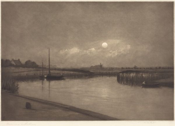Jules André Smith created this etching titled 'Evening Marshes' using a metal plate and acid. Smith's work reflects the artistic climate of the early 20th century, a time when American artists explored themes of nature and the sublime. The image presents a landscape dominated by water and sky, rendered in a monochromatic palette. We can consider how the cultural and geographical context of the United States may have influenced Smith. Perhaps it is reminiscent of the American landscape, with its vast marshes. It is also possible to view this image as self-consciously conservative, adhering to established artistic traditions. Understanding the historical context involves delving into archival materials such as exhibition catalogs, artists' letters, and critical reviews. By doing so, we can gain insight into the artistic values and cultural debates that shaped the creation and reception of works of art like Smith's etching.