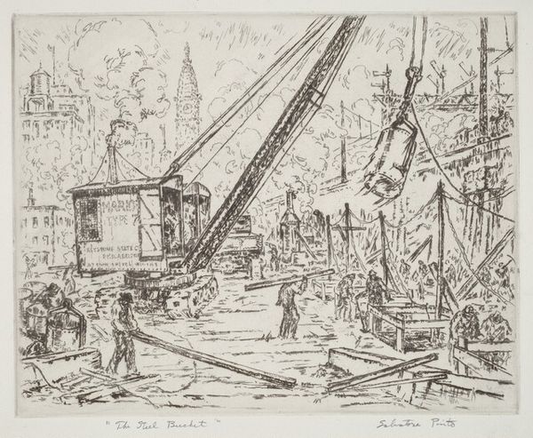 Editor: Here we have Salvatore Pinto's "The Museum," created using ink, as a drawing and a print. It has a very busy composition, filled with smokestacks and trains. How would you interpret this cityscape? Curator: Immediately, my eye is drawn to the stark linearity and textural contrasts. The industrial forms – chimneys, trains, cranes – are meticulously rendered with fine lines. Pinto has deployed linear perspective to create depth, but note how the receding space becomes less detailed, almost dissolving into atmospheric haze. What do you observe about the relationship between the industrial elements and the figures in the foreground? Editor: They seem dwarfed, almost insignificant, next to the scale of the machinery and architecture. Is Pinto perhaps commenting on the impact of industrialization on the individual? Curator: Possibly, but through a formal lens, it's crucial to see how the figures function within the composition. Notice how they provide a horizontal counterpoint to the strong verticality of the factories and chimneys. This tension generates a dynamism within the piece, wouldn't you agree? Editor: I do. I also appreciate the way the smoke, rendered with very delicate strokes, softens the rigid geometry of the buildings. Curator: Exactly! It’s this interplay between hard and soft, linear and atmospheric, that elevates the image beyond a simple depiction of an industrial landscape. It encourages contemplation on form and the subtle emotional resonances it creates. What have you learned from this artwork? Editor: I’ve learned how focusing on the artistic choices and formal elements of a work can create additional levels of meaning! Thank you. Curator: And I learned how much can be learned from open minds!