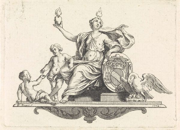 Curator: This pen and ink drawing, titled "Minerva," attributed to Pieter Yver, presents a compelling rendition of the Roman goddess of wisdom and warfare. It dates sometime between 1722 and 1787 and is currently held in the collection of the Rijksmuseum. Editor: My initial impression is one of poised command, but there's something almost domestic about the cross-hatching, which feels repetitive. What can you tell us about how this was crafted? Curator: Yver worked here primarily with line, creating both form and tone through hatching and varied linework, indicative of an engraving, a printmaking technique valued at the time for its reproducibility. Minerva's gaze, that resolute arm gesture – these are timeless visual signals of authority. Editor: Reproducibility points directly to its function: dispersing an ideal, shaping public perception. I’m also wondering about the labor that went into producing so many near-identical copies from a single plate. Did Yver have workshop assistants for that repetitive task, perhaps? Curator: The figure of Minerva here, she is instantly recognizable not only from her helmet and spear but through deeper cultural memory of Classical ideals that artists continually revisit, that give symbolic structure to virtue. The owl, a familiar of Minerva, also rests near her shield as a clear marker. Editor: But notice the way the material constraints of the pen and ink medium itself influences the final piece. The rather repetitive rendering of the drapery, for instance. I see a dialogue here between symbolic representation and material processes that I suspect was deeply ingrained in production at the time. Curator: These images are about establishing connections between virtue, military strength, and learned knowledge. That dialogue exists very much in her confident repose, and it says much about how societies visually encoded the virtues they valued. Editor: Agreed. Ultimately, whether mass-produced or not, the image's strength lies in its complex interplay: Minerva, ever poised between ideals of divine power and the reality of reproducible imagery on paper. The marks themselves tell a story of cultural values manifested materially through reproducible printing technologies.