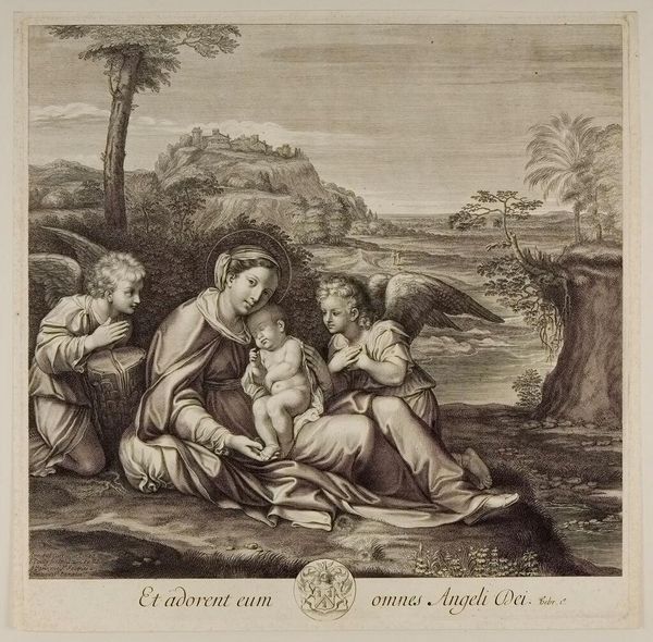 Editor: Here we have Auguste Gaspard Louis Boucher Desnoyer’s "The Virgin of the Cradle." It gives off a classical feel, with the figures arranged so deliberately. What do you make of it? Curator: It's an engraving, meant for broad distribution. Consider the social function of imagery at the time. How did prints like these reinforce religious values and power structures within 19th-century European society? Editor: So, it's less about personal expression and more about public messaging? Curator: Precisely. The style emulates Raphael, lending religious credibility, while the print makes it accessible. What does that suggest about its intended audience? Editor: That context really shifts how I view it. Thanks! Curator: Indeed. Examining the print's role within its cultural landscape deepens our understanding.
