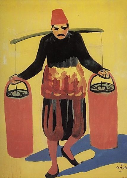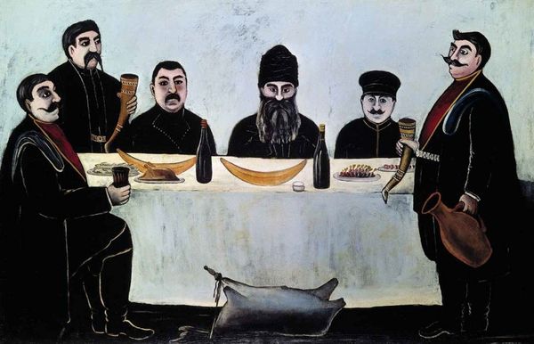 Niko Pirosmani created this painting, "The Feast of Five Princes," with oil on oilcloth, and it’s now held in the Art Museum of Georgia. The painting’s stark, frontal composition immediately draws your eye. The palette is dominated by a cool, muted background that sets off the vivid oranges and blacks of the figures' attire, creating a dynamic tension. The arrangement of the five figures along the table establishes a horizontal rhythm, grounding the composition, but there's an ambiguity in the spatial relationships; the figures seem to exist both within and apart from the space they occupy, which destabilizes our sense of depth and perspective. This tension extends into the semiotic realm. The feast, traditionally a symbol of communal harmony, here seems almost ritualistic, given the subjects' solemn expressions. The formal qualities of the work—the flattened perspective, the tension between color and space—invite us to look beyond the surface and question the codes of representation and meaning. Consider how Pirosmani used form to challenge fixed meanings, prompting us to reconsider the ways in which visual elements can destabilize our perception of reality.