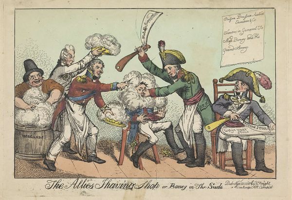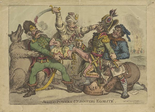 This print, "Lilliputian-Substitutes, Equiping for Public Service," was created by James Gillray. Its vibrant composition depicts figures being outfitted for roles in public service. The image is dominated by exaggerated forms. Note the outsized hat and wig, emblems of status and power, which dwarf their wearers. The figures are comically proportioned. These distortions destabilize traditional notions of authority. The use of caricature serves to undermine the subjects' legitimacy. Gillray uses color to differentiate the characters. Each outfitted in distinct garments that symbolize their roles. This artwork uses a semiotic system of signs to critique the political climate of its time. The oversized garments and accessories act as visual metaphors for corruption and incompetence. The print challenges fixed meanings associated with power and representation. Instead it suggests a world turned upside down, where appearance trumps substance. Consider how Gillray's formal choices—exaggerated forms and symbolic use of color—function not just aesthetically, but also as part of a larger critique of power structures.