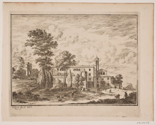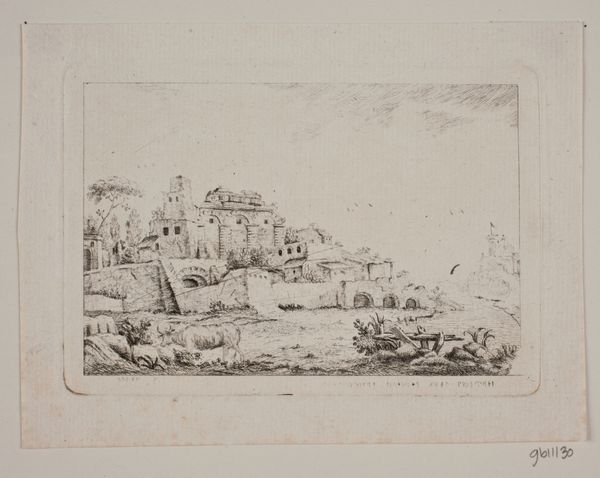 Editor: This is a landscape print of undetermined date, made by Lameau, rendered through etching, engraving, and lithography on paper. The image is delicately wrought. What might the techniques and materials reveal about its context? Curator: Well, let’s start by looking at those layered printing methods. Etching, engraving, lithography… each demands different kinds of labor, different levels of skill, and different technologies for their mass production. This layering tells us that we can’t treat this as simply a piece of high art; it signals a moment where printmaking blurs lines between fine art and reproduction for wider consumption. Editor: So, the techniques used affect the interpretation. Does the neoclassicism style factor into that reading? Curator: Absolutely! Neoclassicism in prints often served specific social and political functions. Consider who could afford such prints, who consumed them. It becomes less about aesthetic contemplation and more about class and cultural capital. The means of production and the intended market cannot be decoupled. Editor: I never thought of neoclassicism in those terms before, always as simply a style. Curator: Precisely! The materials – the paper, the ink, the printing press itself – were commodities. Even the artist’s labor became a commodity. Viewing it through that lens really reshapes how we see it. Editor: It changes the relationship to the landscape as well. Instead of nature as pure beauty, it is commodified. Curator: Indeed, think of it less as a pristine, idealized scene and more as a manufactured product shaped by and contributing to a network of material exchange. Editor: I am now looking at the art, the market, and the production…all together! Thank you. Curator: The connections and relations shape it.