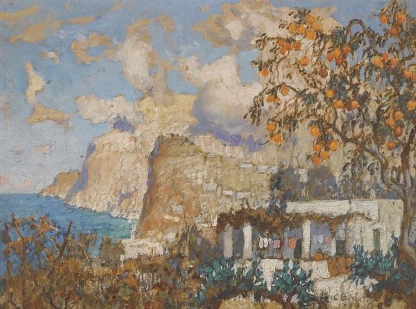 Curator: Konstantin Gorbatov’s “Village with Two Figures,” created in 1924, offers us a glimpse into a world steeped in the visual language of Russian landscape. Editor: It immediately strikes me as a very gentle, almost wistful scene. The soft pastels and the hazy quality give it a dreamlike feel. Curator: I agree. Gorbatov was painting during a tumultuous time in Russia, just after the revolution. This artwork can be seen as a poignant commentary on the changes and upheavals happening in Russian society at that moment. He painted many landscapes which show nostalgia for a disappearing way of life. We can trace those feelings in other works that feature scenes of Russian churches and other symbols. These scenes would eventually be heavily suppressed and altered during the Soviet period. Editor: Focusing on the artistic approach, the way he uses watercolor and possibly pastel creates this interesting layered effect. Notice the bright blues of the domes and how they draw your eye upwards, contrasting with the earth tones of the village itself. It guides the viewer. Curator: The use of watercolor as a medium itself speaks to a certain fragility, doesn’t it? Given the context of the time, that feels particularly resonant. The two figures in the foreground appear diminutive, almost lost within the vastness of the landscape. Perhaps it alludes to feelings of powerlessness during great upheaval. Editor: Indeed. And if we examine the composition structurally, we see how the artist divided the space into clear zones. There's the foreground with the figures, the middle ground dominated by the village, and then the more distant view of the sky. This lends a sense of depth and vastness, and there’s a lot of activity in the sky with his use of colour too. Curator: This work makes one consider the weight of history on individual lives. It offers insight on Russia in the early 20th Century. The dream-like nature of this composition allows the viewers to see a painful, reflective time in our history. Editor: For me, this is a delicate rendering, executed with skill, that speaks about an attempt to grapple with depth through texture and hue, through layering in a very complex rendering of spatial and chromatic organisation.