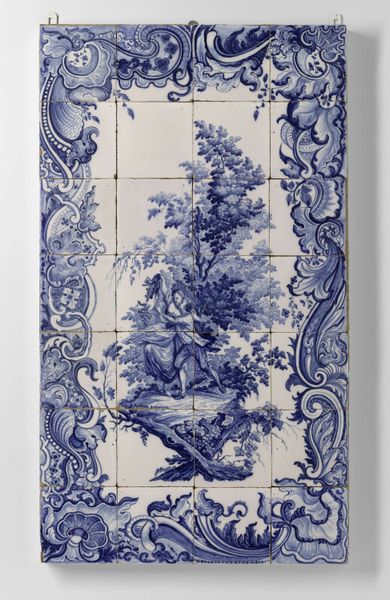 Curator: These tile panels by Johannes (I) Aelmis, dating from about 1760 to 1780, offer a glimpse into 18th-century life and artistic practices. The title is “Three Tile Panels with Autumn, Summer and Spring.” Editor: My immediate reaction is this evokes a quiet intimacy, something precious and handmade. The cool blues against the white ceramic creates an almost dreamlike state. What sort of environment might these panels have lived in? Curator: Quite likely, these panels were functional pieces, set into a wall perhaps in a kitchen or hallway. Delftware tile panels like these, showing people enjoying the seasons, carried moral weight by depicting an idyllic way of living tied to seasonal change, symbolizing life’s transience and fulfillment found in the natural order. Editor: It’s interesting that such a decorative item likely had utilitarian functions and would have been used every day. And what does it mean to choose fresco techniques – how do we think about these decisions from a material perspective? It seems far from practical… Curator: In Rococo art, representations of courtship, leisure and country life reflect ideas about virtue, pleasure, and idealized love that defined social status for affluent viewers, evoking a sort of cultivated naivete and leisure. What about the cage? Editor: The cage perhaps shows the aspiration toward the possession of the intangible like spring’s beauty captured but restrained, much like high art seeking the ideal form. Were these techniques seen as ‘high’ or ‘low’ forms of making during this time period? Curator: That’s difficult to say since miniature genre scenes in ceramics occupy a sort of middling zone between decoration, craft, and fine art. I would say, given the labor involved, these were costly decorative objects for wealthy buyers. Editor: Thinking about it today helps question these separations – a dialogue continues with each maker who, knowingly or not, asks us to question these artistic boundaries. These works collapse our perception of time. Curator: That's precisely what images can do; they carry memories, and invite conversations through time, reminding us of our relationship with nature. Editor: These modest tiles are surprisingly expansive, they remind us to pause, slow down, and appreciate craft.
