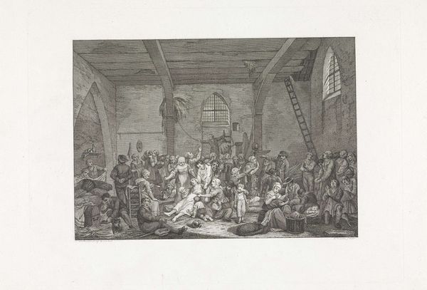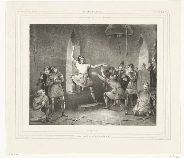 Editor: Here we have "Aanslag van Jean de Jauregui op prins Willem I, 18 maart 1582," an engraving by Johann Wilhelm Kaiser made sometime between 1855 and 1865. It’s quite dramatic! The moment captured is filled with chaos and movement, but what strikes me is the level of detail achieved through the engraving process. What aspects stand out to you? Curator: Considering this engraving through a materialist lens draws attention to the production of printed images, and its relationship to the depicted subject. What socio-political power does Kaiser wield through this engraving medium? How does that contrast with, or perhaps, subtly mirror, the subject it presents? Editor: Interesting! I hadn't thought about the power dynamic in *creating* the image. So, the artist, using the tools of engraving, is making a statement about the attempt on William I’s life and disseminating it, which carries a different weight than, say, a painting commissioned by royalty. Curator: Precisely! The print medium democratizes this scene, enabling mass consumption and shaping public opinion on Willem’s role in that time, which differs from the exclusivity and symbolic weight attached to painting for nobility. Furthermore, consider the labor: the engraver's craft, the printing press operators—a whole industry engaged in reproducing this moment. Who profits? And what meaning is imbued through these processes of production and distribution? Editor: I see what you mean. It moves the conversation beyond just the historical event to the social and economic context in which it was made and distributed. Curator: Exactly! Thinking about the lines etched into the metal, the ink pressed onto the paper, we begin to see the art not just as a representation but as a material object deeply embedded in its time. Editor: That makes me see engravings in a whole new light! It’s about more than just the image, it’s about the whole process and its place in society. Curator: It encourages a wider understanding of the labor and networks shaping our art experience.