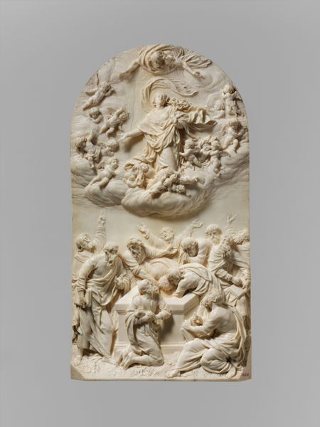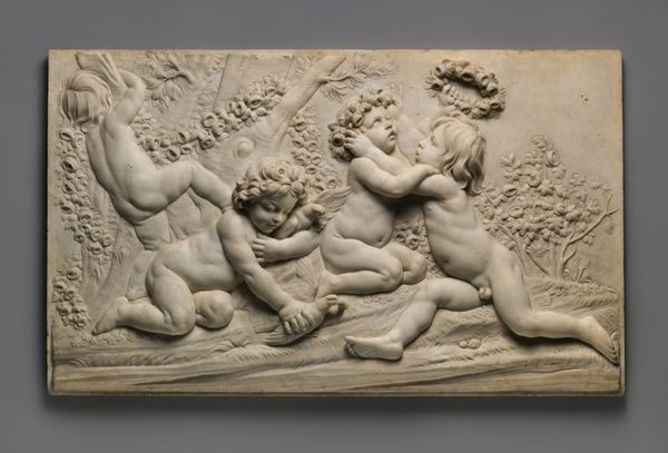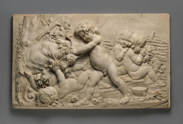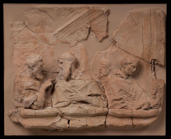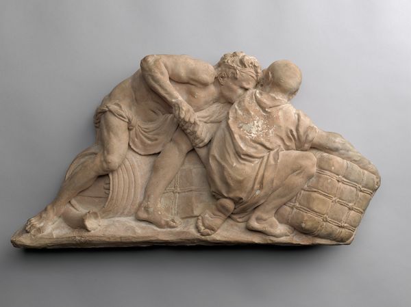 This terracotta relief, "The Judgement of Junius Brutus," was created by Artus Quellinus in the 17th century. The composition is a tableau of raw emotion, framed by the rough, textured surface of the clay. Quellinus uses depth sparingly, creating a shallow stage for his figures. The eye is drawn to the stark contrast between the impassive Brutus and the violent executioners. Brutus’ extended arm creates a strong diagonal line, mirroring the executioner’s downward swing, visually binding justice and brutality. The rough texture of the terracotta accentuates the drama, lending a tactile quality to the scene. The figures' muscular forms are rendered with a Baroque sensibility, emphasizing dynamic movement and emotional intensity. The limited depth flattens the scene, creating a sense of claustrophobia, mirroring the inescapable nature of fate. This work challenges us to consider the relationship between power, justice, and sacrifice, leaving us to ponder the complexities of moral decisions.