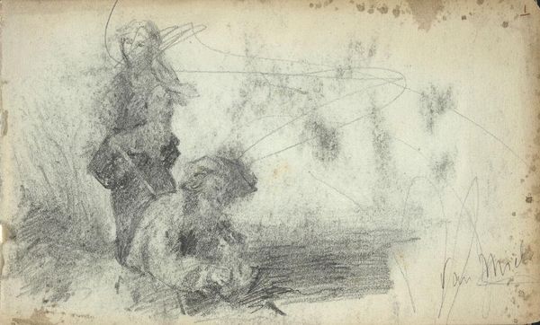 George Hendrik Breitner sketched these figures in charcoal and ink. The figure on the right evokes a sense of melancholy, a motif traceable back to ancient depictions of grief and introspection. Think of the classical philosophers, often portrayed in contemplative poses, heads bowed, embodying the weight of thought. This posture, laden with sorrow, finds echoes across centuries, from medieval religious art depicting mourning figures to Renaissance portrayals of pensive scholars. The bowed head isn’t merely a physical gesture; it's a visual shorthand for inner turmoil, a universal symbol recognized across cultures and epochs. Consider how such gestures tap into our collective memory, stirring emotions buried deep within the subconscious. The artist uses this to evoke the profound and universal experience of human suffering. These resurface, evolve, and take on new meanings in different historical contexts, reflecting the cyclical nature of human experience.