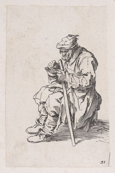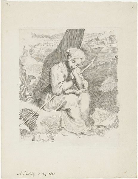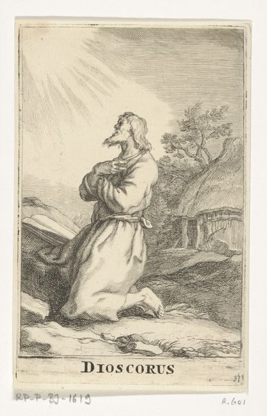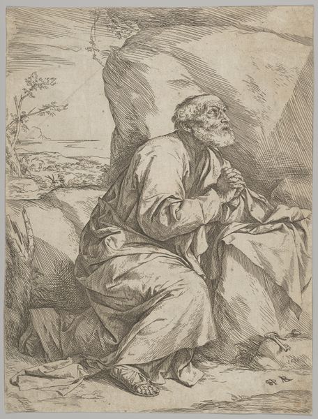 Editor: Here we have J. Kuyper's "Old Man Praying by a Rock," an etching from 1862. The detail is remarkable, especially given it's a print. I am intrigued by the tools in the lower right, and am curious about what they tell us. What stands out to you about this print? Curator: The etching technique itself is critical. Consider the labor involved: the repeated, painstaking work of incising lines onto the metal plate to create the image. The varying weight of those lines creates the illusion of depth and light. Is it not craft elevated to the level of fine art, pushing against these restrictive, hierarchical definitions? Editor: Definitely. The craft is evident. But who was Kuyper’s audience here, and what's the purpose of the print in contrast to, say, a painting of a similar subject? Curator: Prints like this from the mid-19th century had a wide circulation due to industrial manufacturing processes. Multiple copies could be produced, democratizing art. Note the religious theme: an old man kneeling. Who is this man and what societal ideals are suggested here by his devotional act, rendered in a highly reproducible format for a potentially broad audience? What labor fueled his belief and sustained his devotion? The inclusion of tools in the immediate foreground reminds me that he likely uses tools. Editor: The reproducibility is really key to understanding the piece. Would the act of worship have different implications to diverse socioeconomic classes? Curator: Precisely. It is also a reproduction and re-creation of faith through industrial methods. It is important to realize that materials such as printing plates may wear down and were at that time typically reworked or re-etched. That fact reminds us to be constantly cognizant of the art production process that enables circulation. What story of spiritual devotion and endurance is this man meant to tell? Does he speak for others like him? And, fundamentally, how is that story shaped by the means of its production? Editor: Seeing it as part of an industrialized, reproductive process makes it more compelling. Thanks, that gives me a lot to consider. Curator: Yes, thinking about the act of creating the reproduction provides further insight into our appreciation for the work as it survives today.