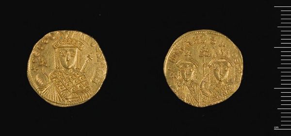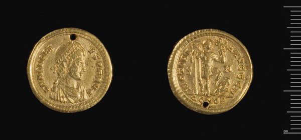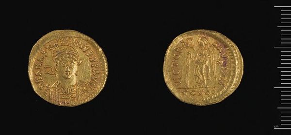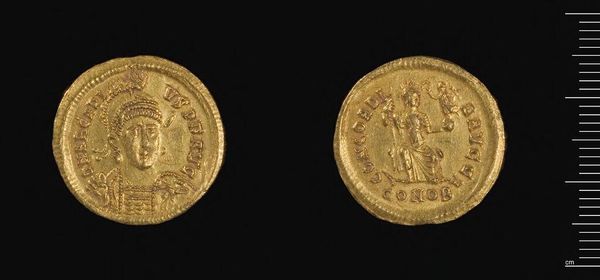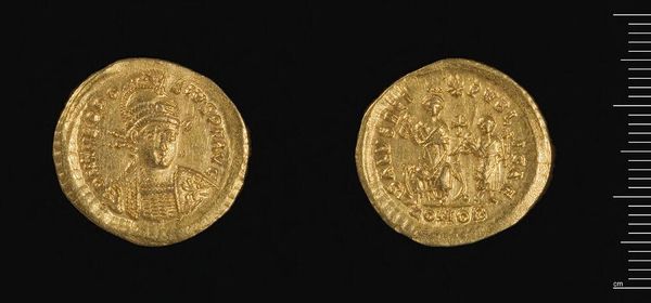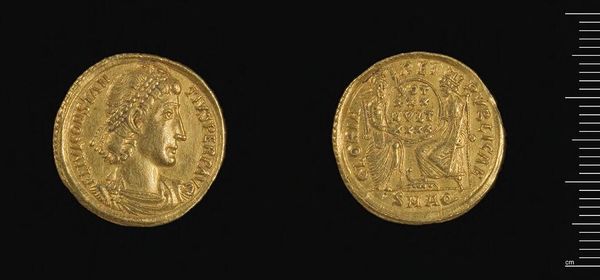 Curator: The lustrous quality of this gold immediately draws the eye. Editor: It's quite tactile, isn’t it? This is a Solidus of Constantius II, crafted in Antioch. Notice how the artist used the circular form to frame and unify the imagery. Curator: Yes, the coin is divided into two distinct sides. The emperor's portrait on one side gives way to a seated figure, likely Roma or Constantinopolis, on the other. Editor: These symbols are embedded in the cultural memory of the Roman Empire, representing power and continuity. Curator: Indeed. The use of gold as a medium is not simply for currency, but also for conveying imperial authority and status through its inherent material value. Editor: Considering its size, it's amazing the way it encapsulates the grand narrative of an empire, doesn't it? Curator: It does offer us a unique lens into the artistic and political values of the time. Editor: Absolutely. A fascinating glimpse into a bygone era.